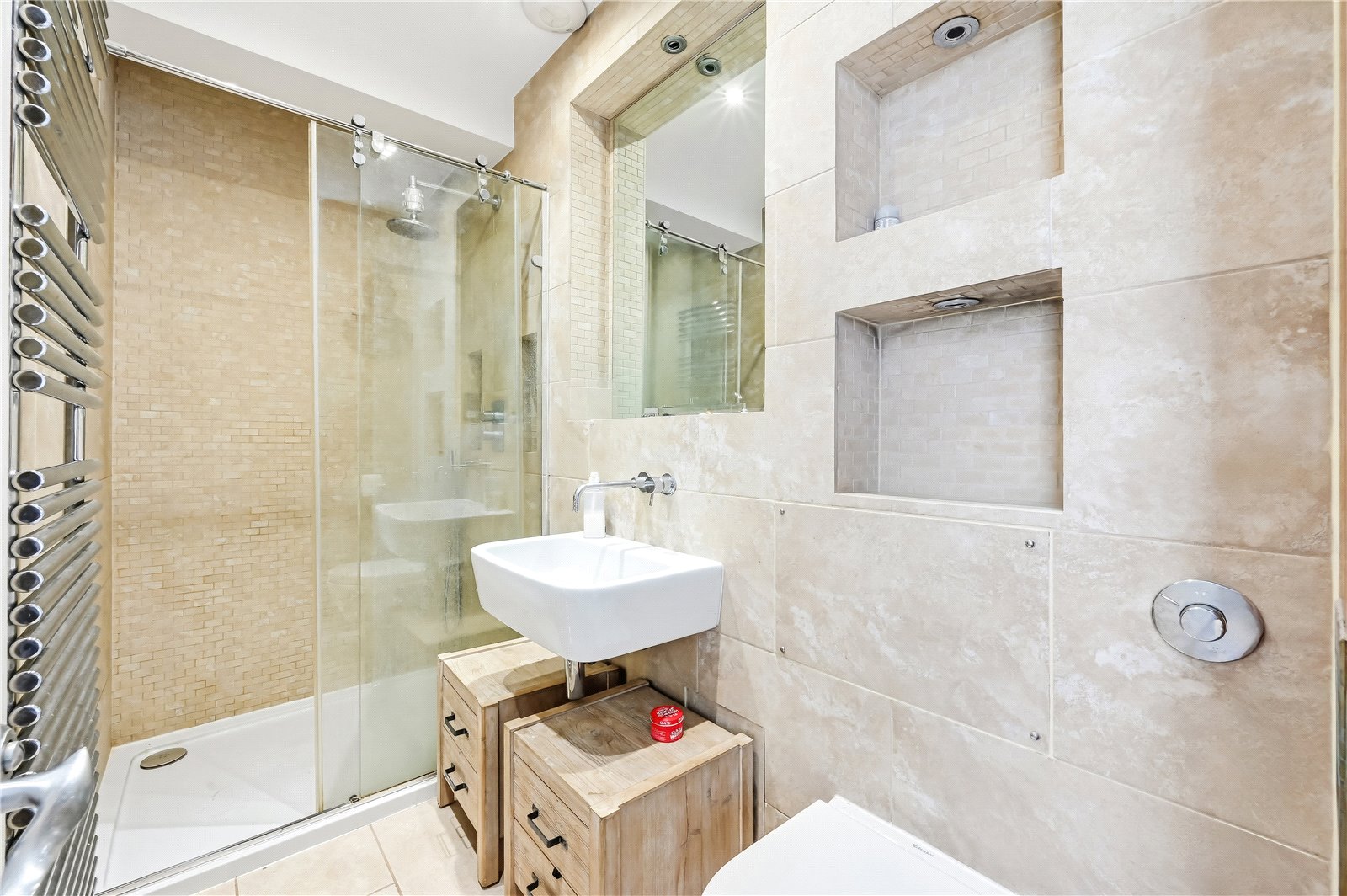 This beautifully presented apartment is arranged over two floors and has an abundance of light and space on offer. The ground floor comprises two bedrooms, both with ample storage and two bathrooms. Stairs lead down to the lower floor (with private lift access too). Here you will find a spacious open plan kitchen/living/reception room and an outside patio garden. There is also a demised loft space providing further storage on the ground floor. The flats in the building are also entitled to a key for Queen's Gardens communal garden opposite