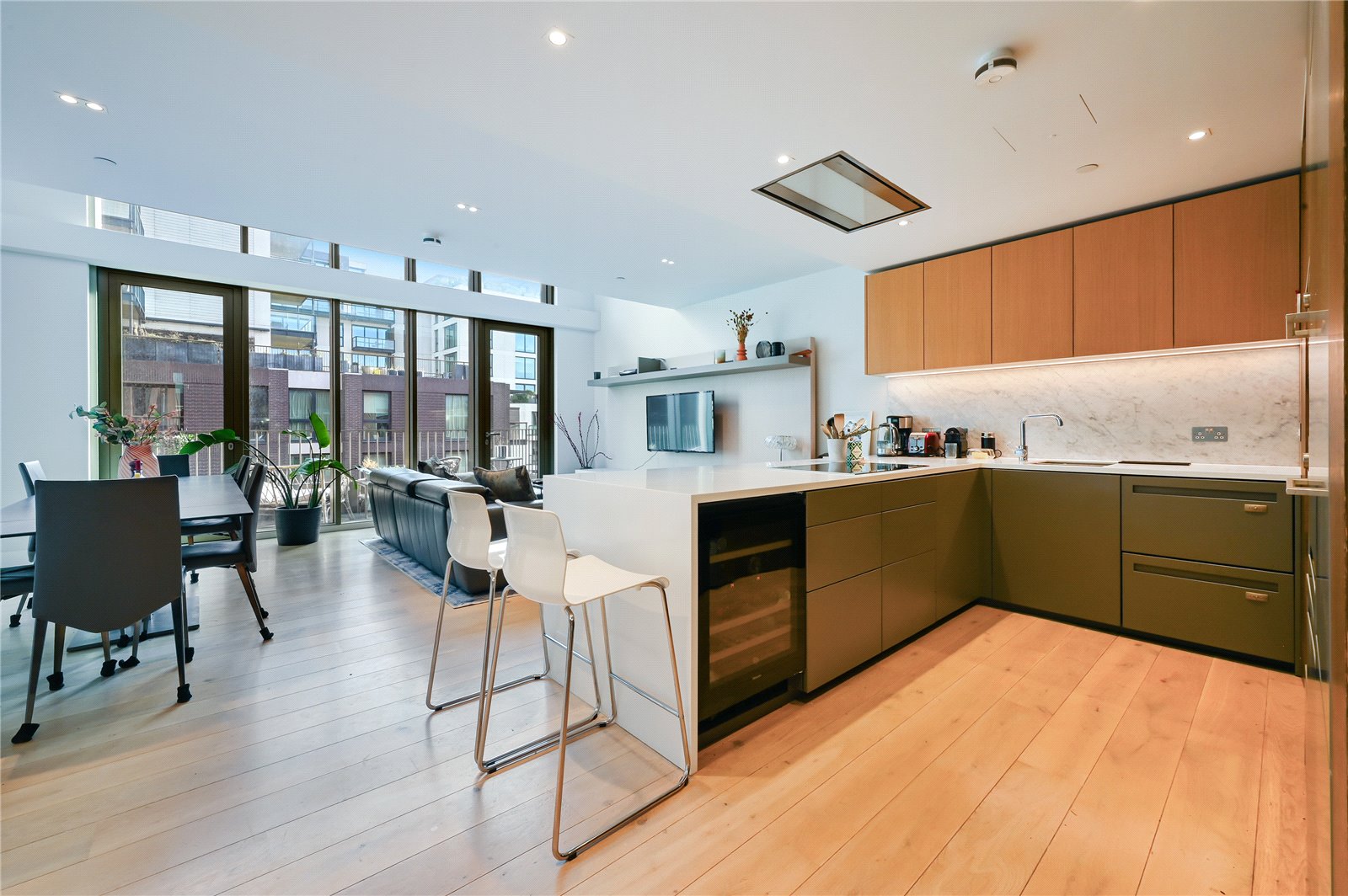 Arranged across three levels and offering a large open plan kitchen and reception, the property offers three bedrooms with a further study and utility room. Two private balconies offer views of the Regent's Canal and Gasholders Park.