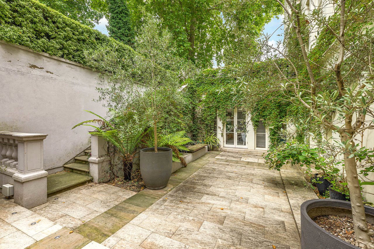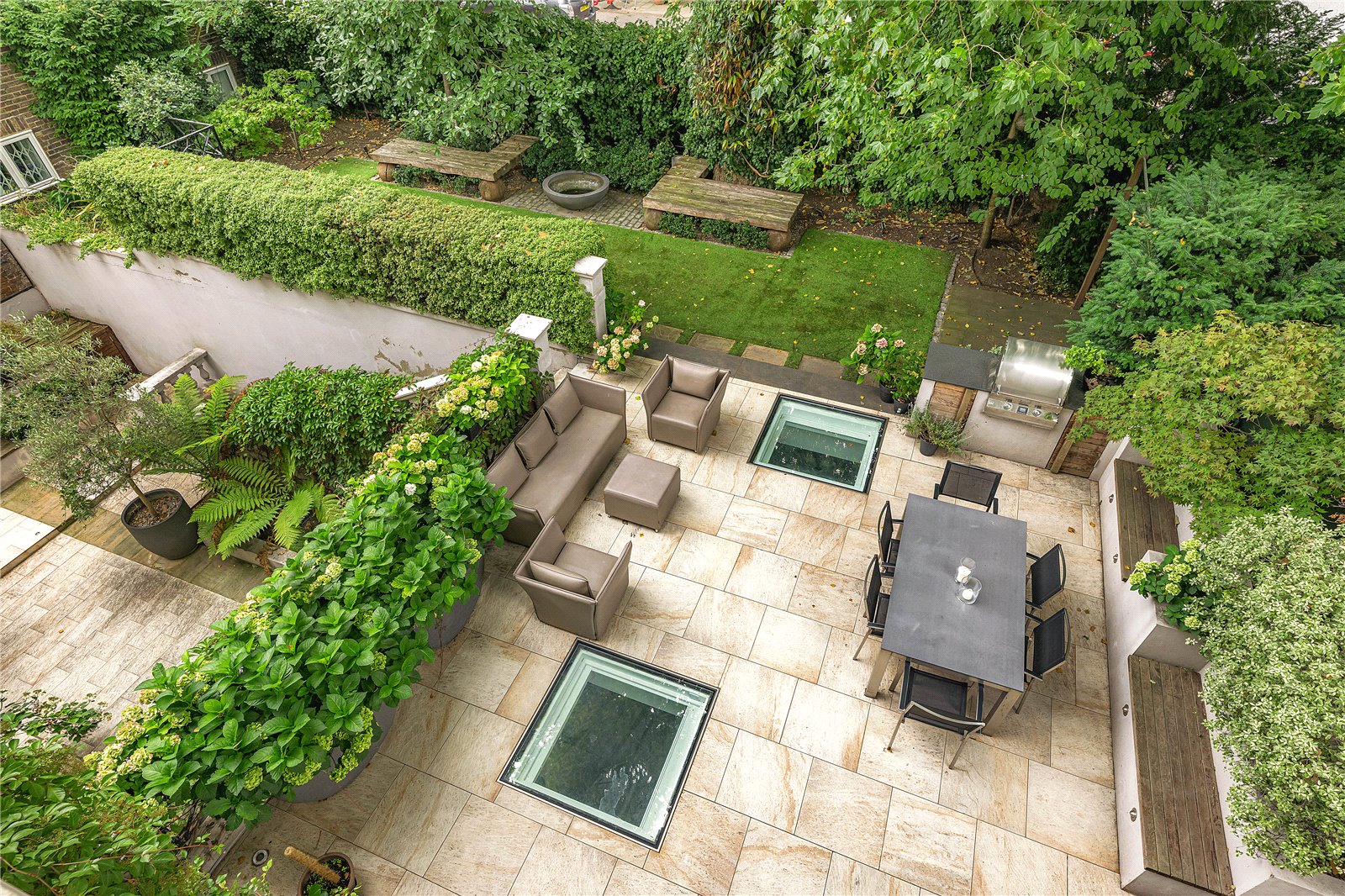 Outside, in addition to the courtyard, a mature and meticulously landscaped garden offers a tranquil retreat for relaxation or entertaining. Extending to approximately 3,165 sq ft, it is one of the largest private outdoor spaces in this part of London.