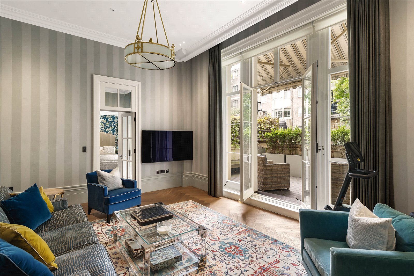 A sweeping staircase leads to the first floor, home to the exceptional principal suite with 3.76m ceilings, a superb dressing room with floor-to-ceiling wardrobes, and views towards Hyde Park. This level also includes an additional bedroom suite, a sitting room, and a private terrace.