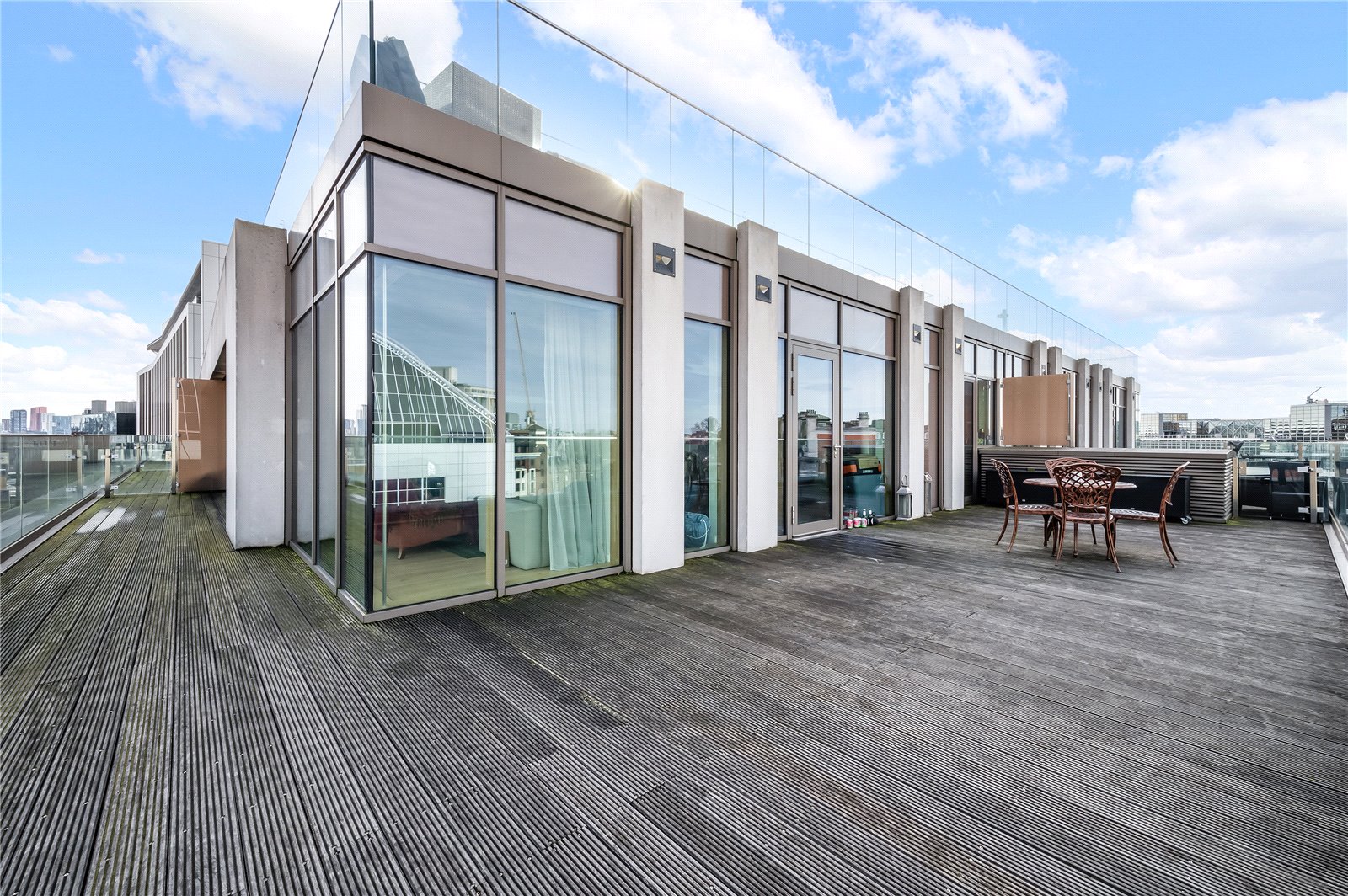 This three-bedroom apartment benefits from open plan living space with full-height glazing offering panoramic views of London and has its own private terrace.